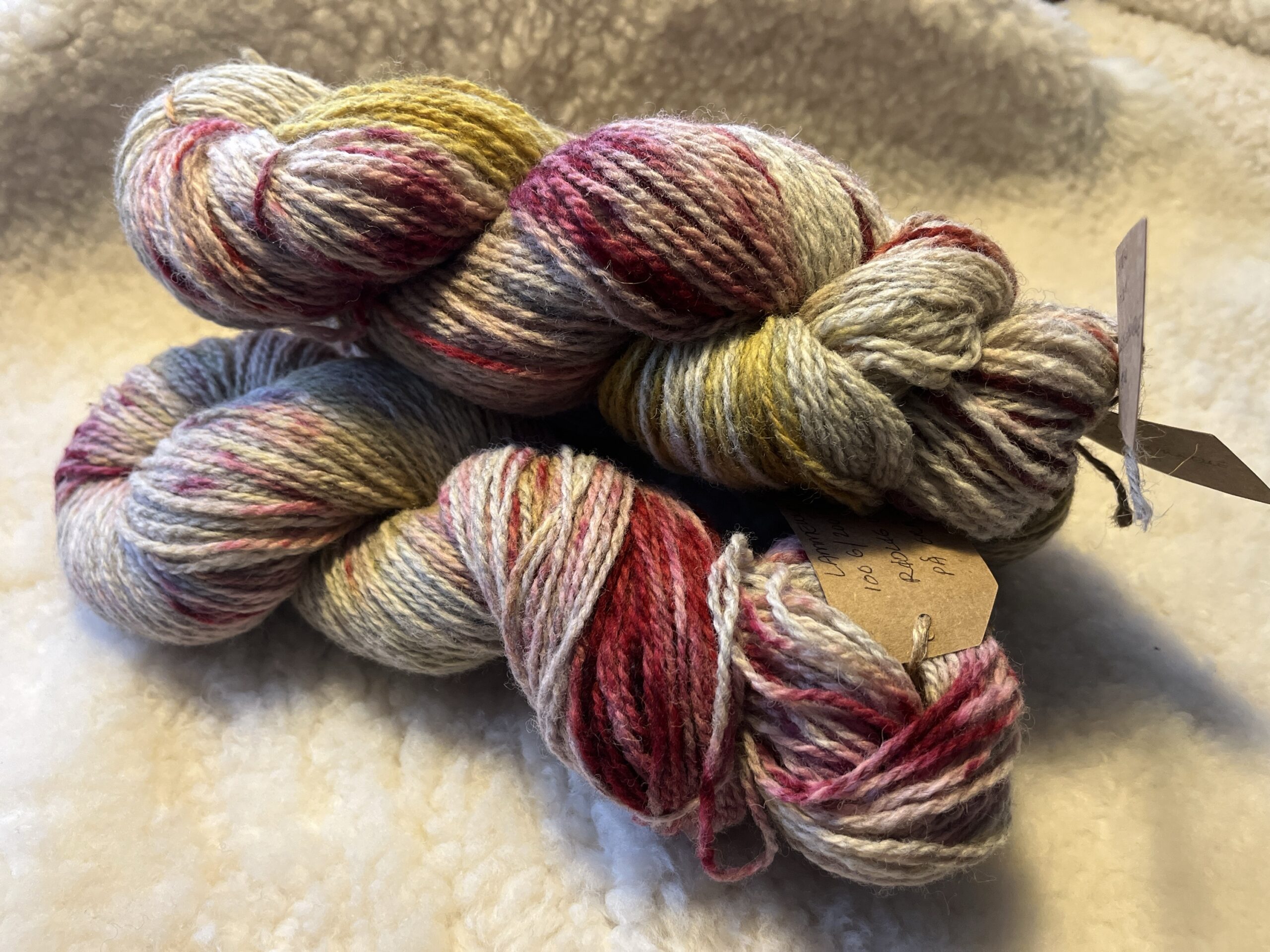 Disse fed at lavet på grå lammeuld, hvor toner fra rødløgsskaller og cochinelle skaber et unikt og særligt farvespil.