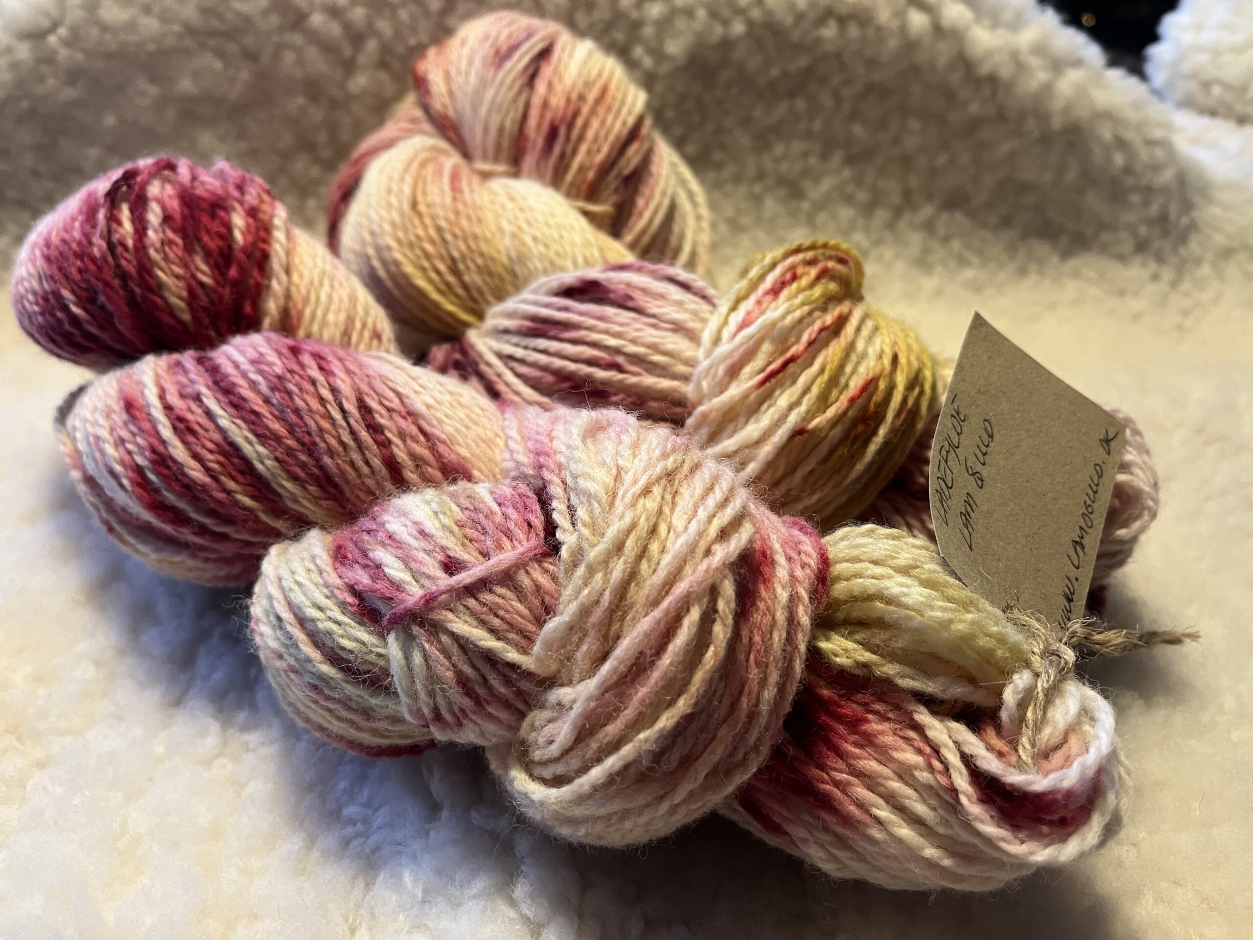 Disse fed er lavet på en lækker hvid lammeuld, indfarvet med lyng og cochinelle, som virkelig klæder hinanden.