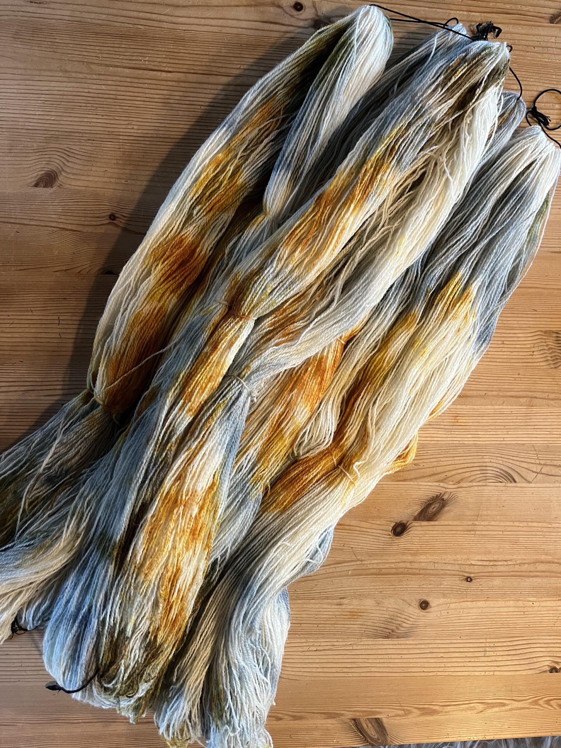 Plantefarvet med ligusterbær og røde og gule løgskaller.